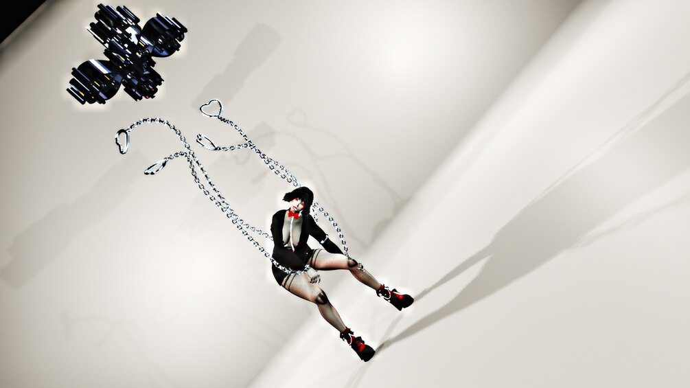 Body base | Head base | Head Makeup (Strongly Edited By Me) | Hair | Razor Blade | Razor Earring Set | Blazer | High Heel Boots | Pasties | Panties | Fishnet Stockings | Fingernails | Bowtie Choker Leash | Yandere Knives | Puppet Chain Rig | Puppet Body Texture
