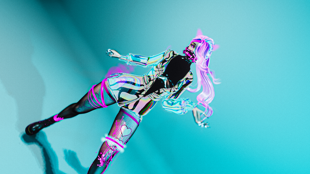 ๐Ÿ’œ - Clothing: Two bodysuits, holographic jacket, a crop top with fishnet sleeves, shorts, pasties, panties, fishnet stockings, boots