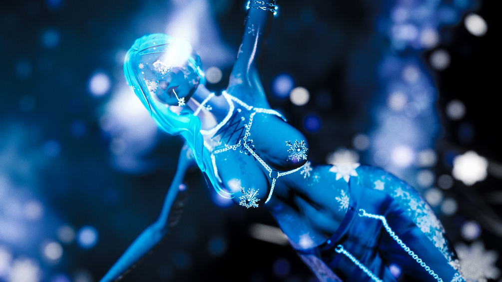 Body Base | Head Base | Tattoo Texture | Eye Texture | Bun Hair | Pigtails | Long Hair | Boots | Snowflake Face Accent | Snowflake Earring, Pasties and Mouth Chain | Harness | Arm Chain | Pants | Bodysuit, Lacing, and Choker | Playsuit | Hooded Cape | Snowflake Belt | Heels | Mittens | Snowflake Choker | Blindfold | Nails | Hand and Eye Snow FX | Icy Breath FX | Room Snow FX | SPS | GoGo Loco